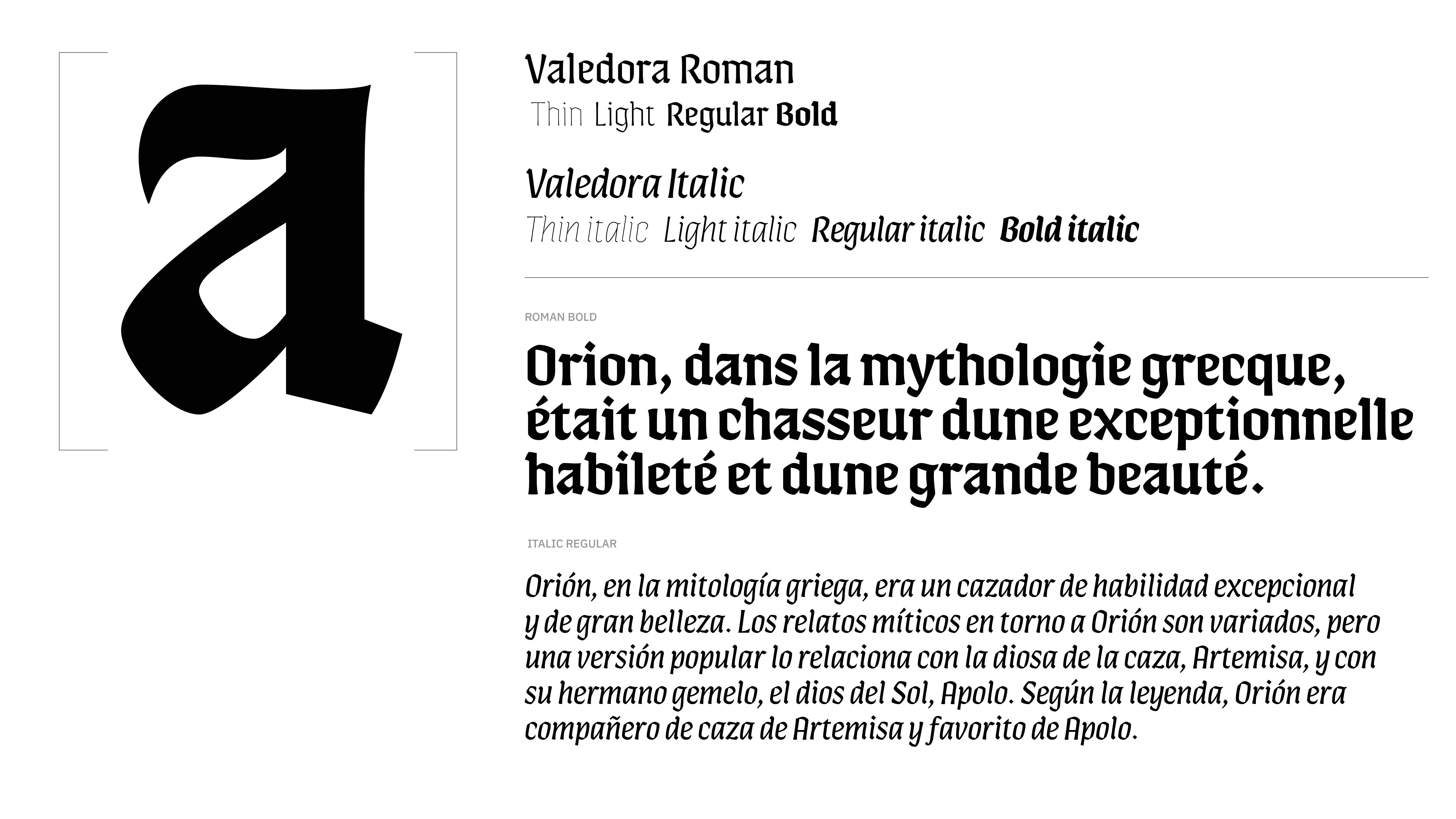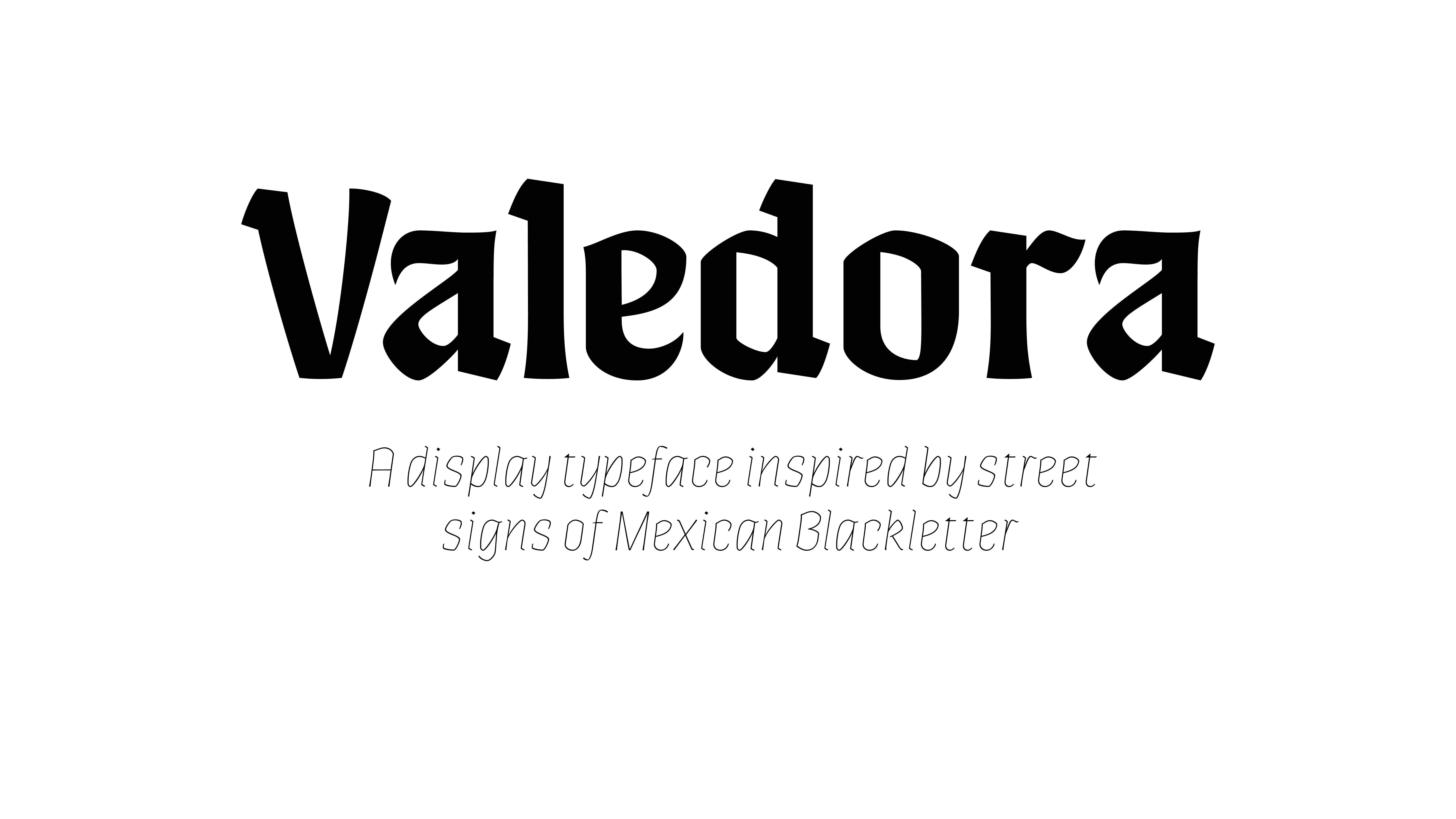 Valedora is a display typeface inspired by Mexican Blackletter street signs. Its design aims to capture a dynamic interplay of expression, strength, and contrast.